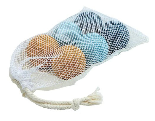 Juguete de madera multicolor no tóxico, de diseño atractivo que fomenta la imaginación de los niños en edad preescolar. Incluye: 6 pelotas de madera pintadas con color amarillo azul, azul claro 2 bolas pequeñas y bolsa blanca